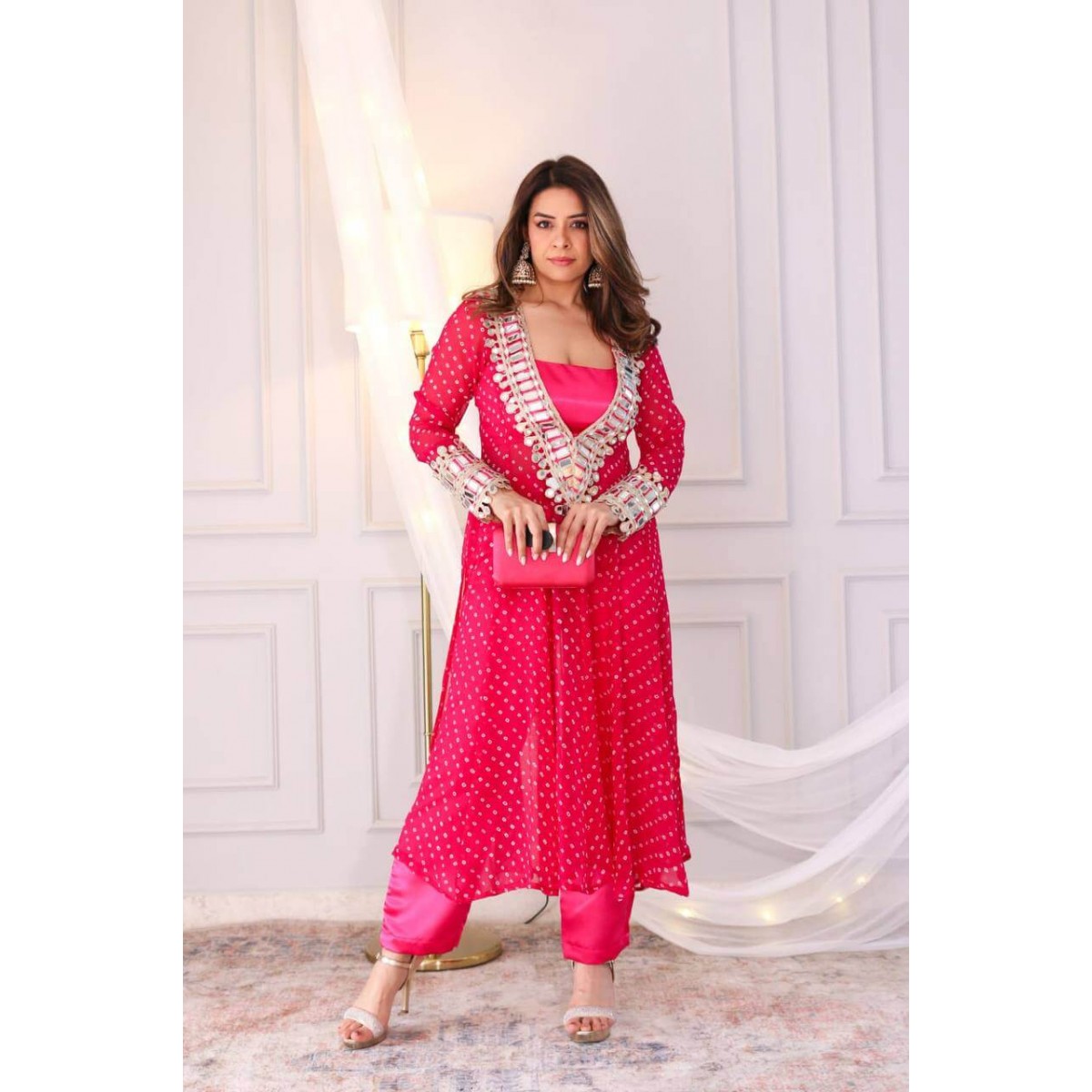 This exquisite 3-piece set features a kurti, pent, and blouse crafted on premium Chinon fabric with digital print and intricate real mirror handwork.