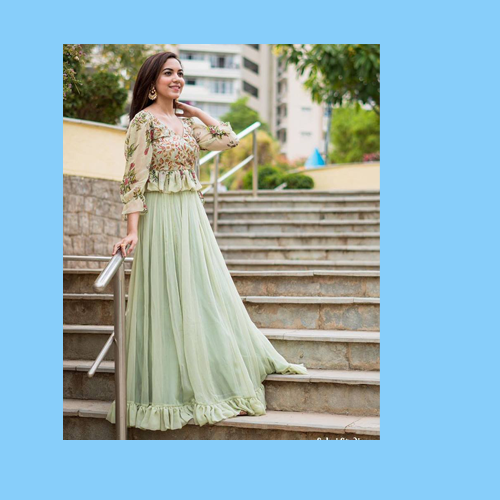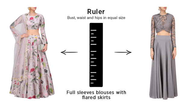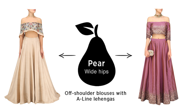 For Apple Shaped body like if body contains fat around waist then chooses Peplum tops with full flair Lehenga .