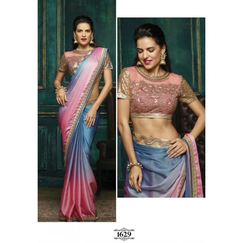 Matching colours in different shades is fun. It takes attention to intricate details. But if you want something more fun, go for statement colours. Team up a bright coloured blouse with a pretty safe coloured saree. For example, pink blouse with a blue saree, or a yellow blouse with a brown saree. This style looks good when both, the saree and the blouse are all plain, without any prints. But since they are sangeet function dresses, there must be some golden or silver contrasting sequins and embroidery on the borders of both the pieces