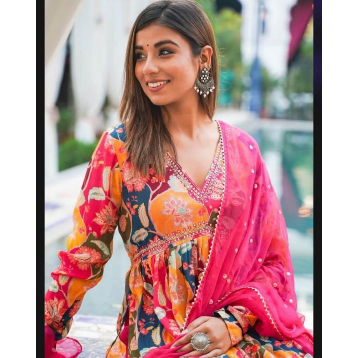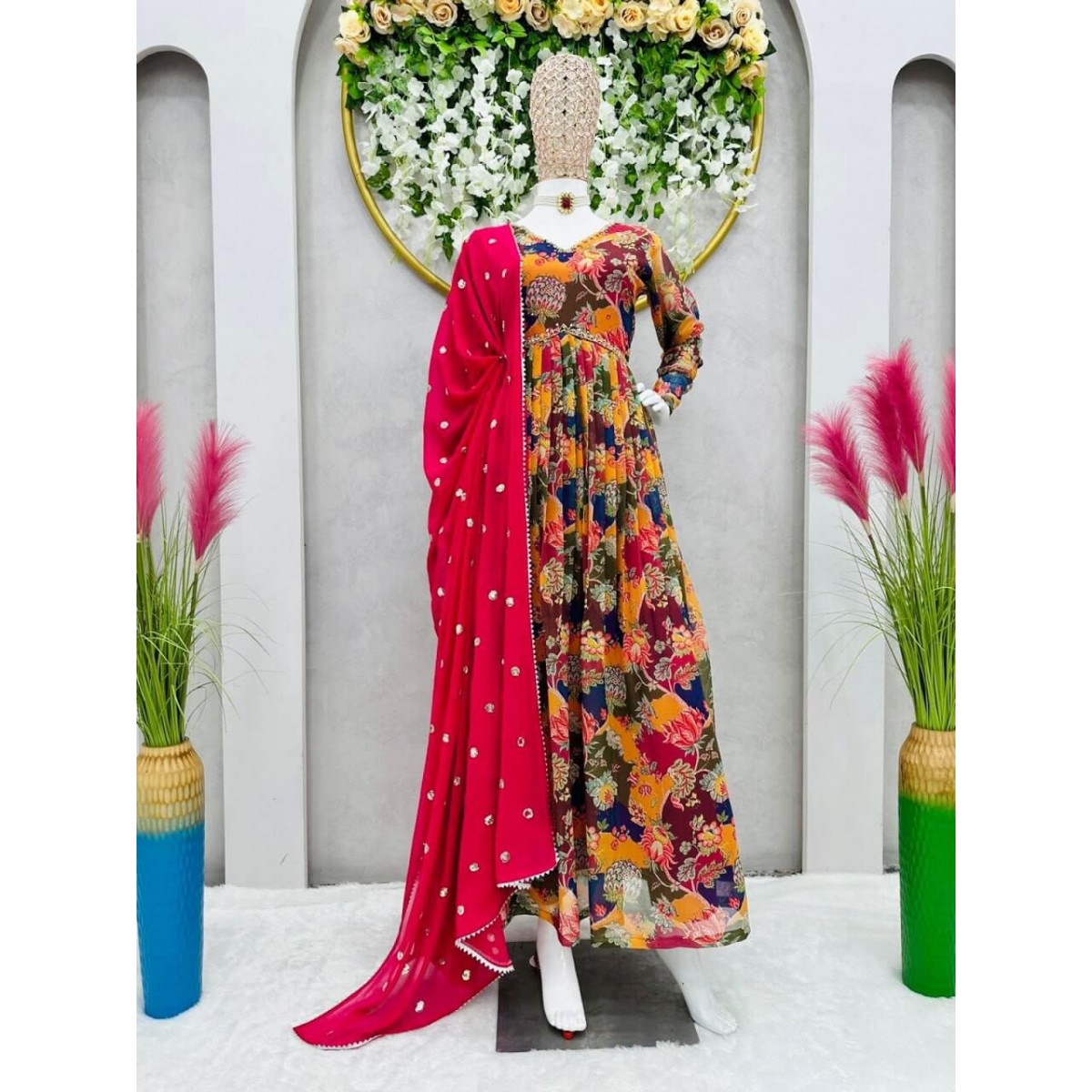Looking for this same colour beautiful Designer Suit On havy Faux Georgette febric with inner and Digital print & Hand work and Pent on Crep febric and Dupatta on Faux Georgette febric with Sequnce work with Fancy Lace.