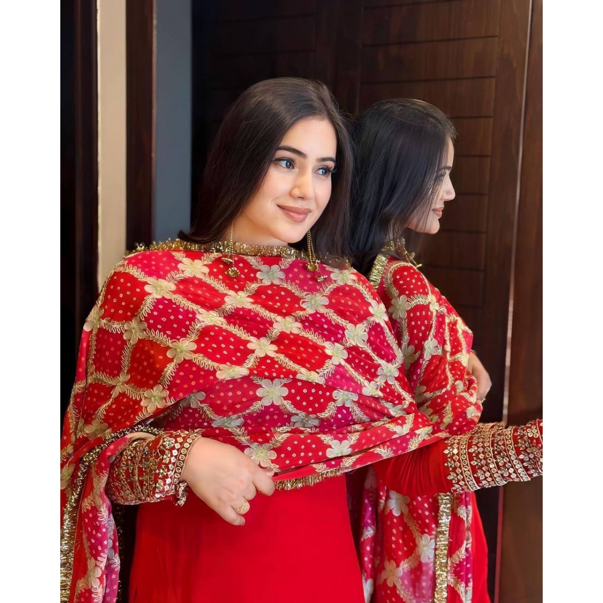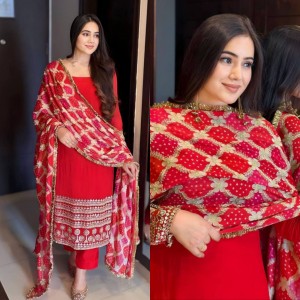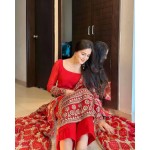 If you want to attend any auspicious religious function or wedding occasion this Designer red suit is a best option. You can also choose it as a karwa chouth outfit.