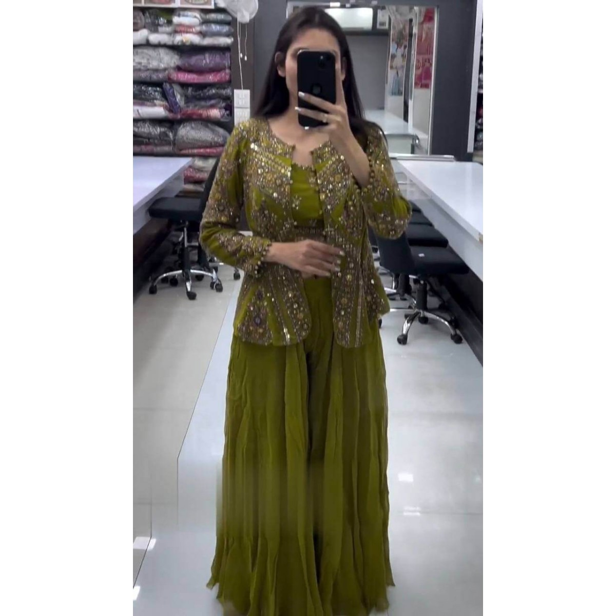 • SHARARA FABRICS :Faux georgette .thread with sequence work stitched free size with elastic