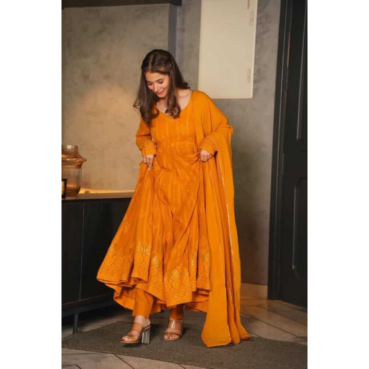 Package Details 1 gown/1 dupatta Gown fabric Taffeta Silk Gown Stitched type full s..