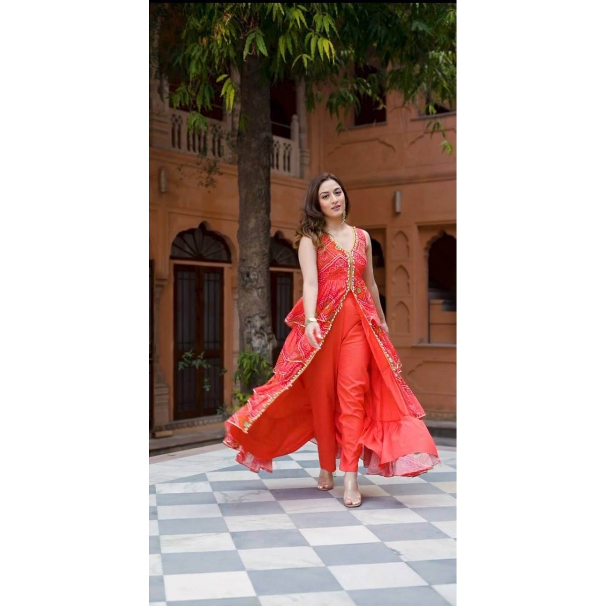 Auspicious red bandhej style trendy ruffle suit