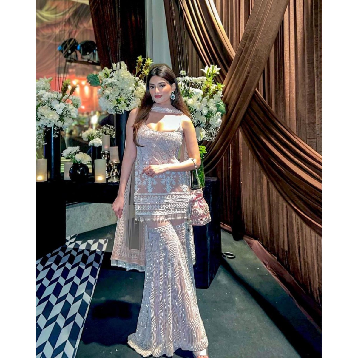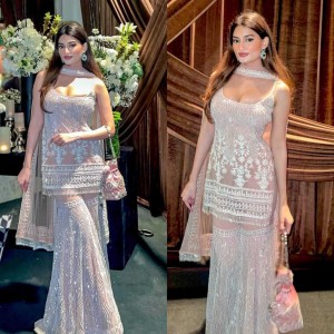 Beautiful chain stitched work net fabric sharara suit