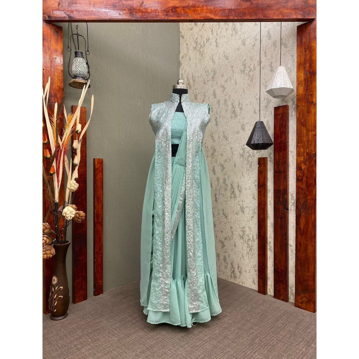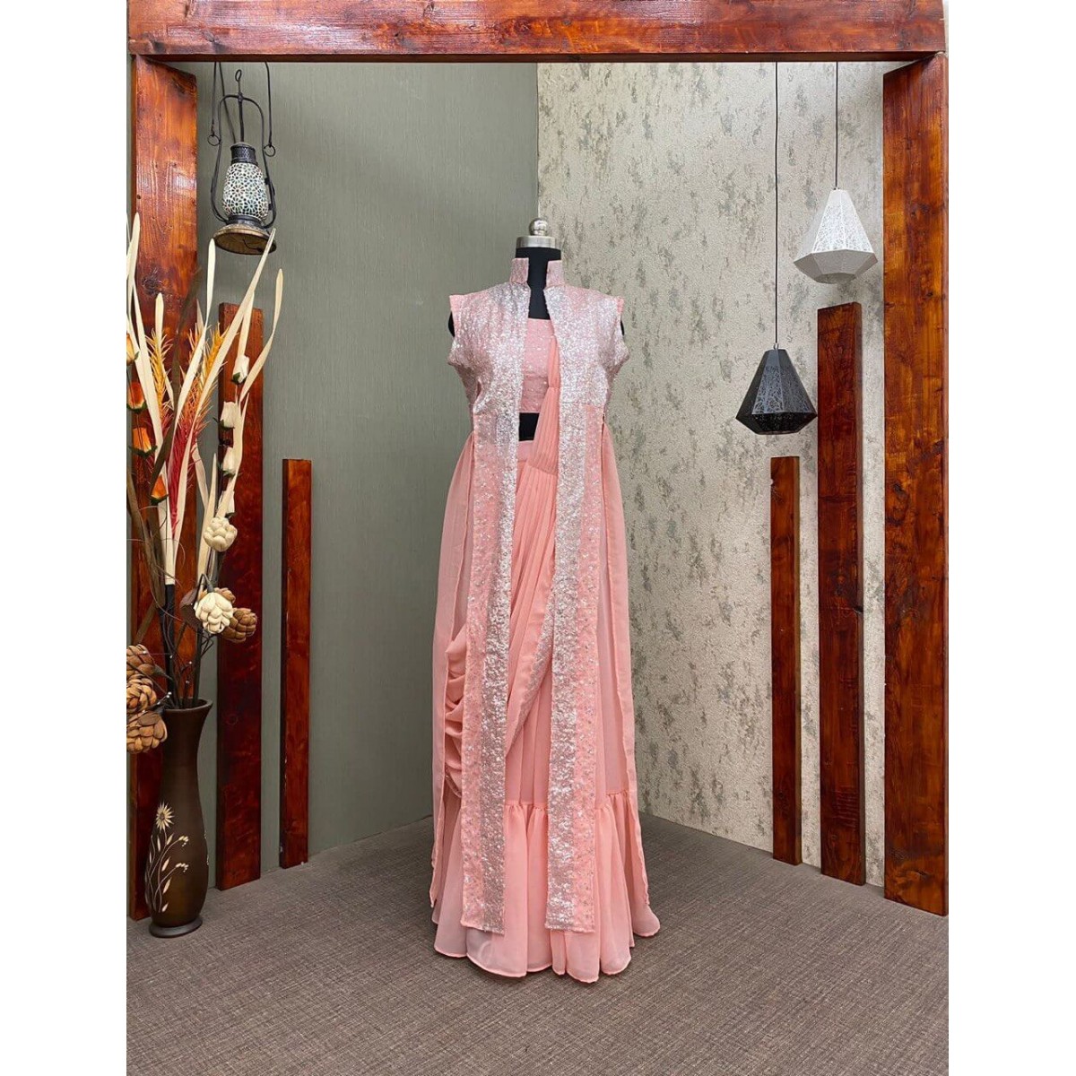 • LEHENGA SAREE : GEORGETTE WITH FANCY DREPE  FULLSTITCHED LEHENGA SAREE WITH FULLFLAIR AND RUFFLE WITH SEQUENCE LACE WORK