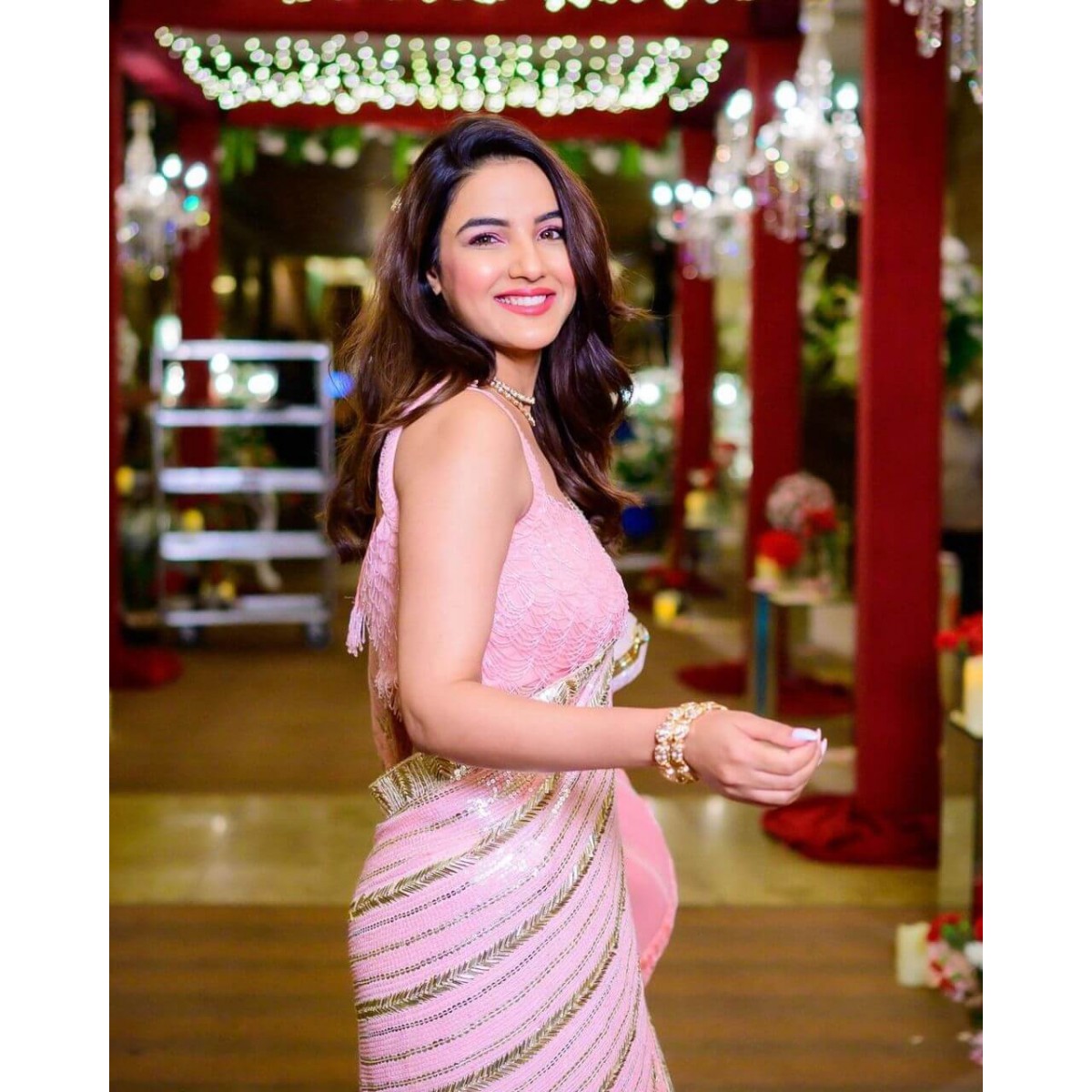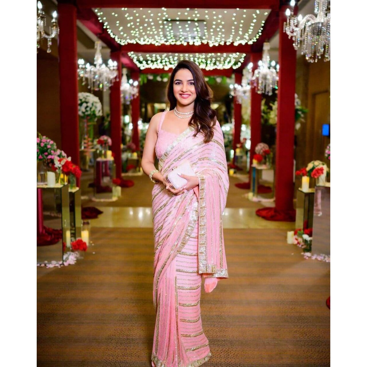 Jasmin bhasin pink color sequence saree