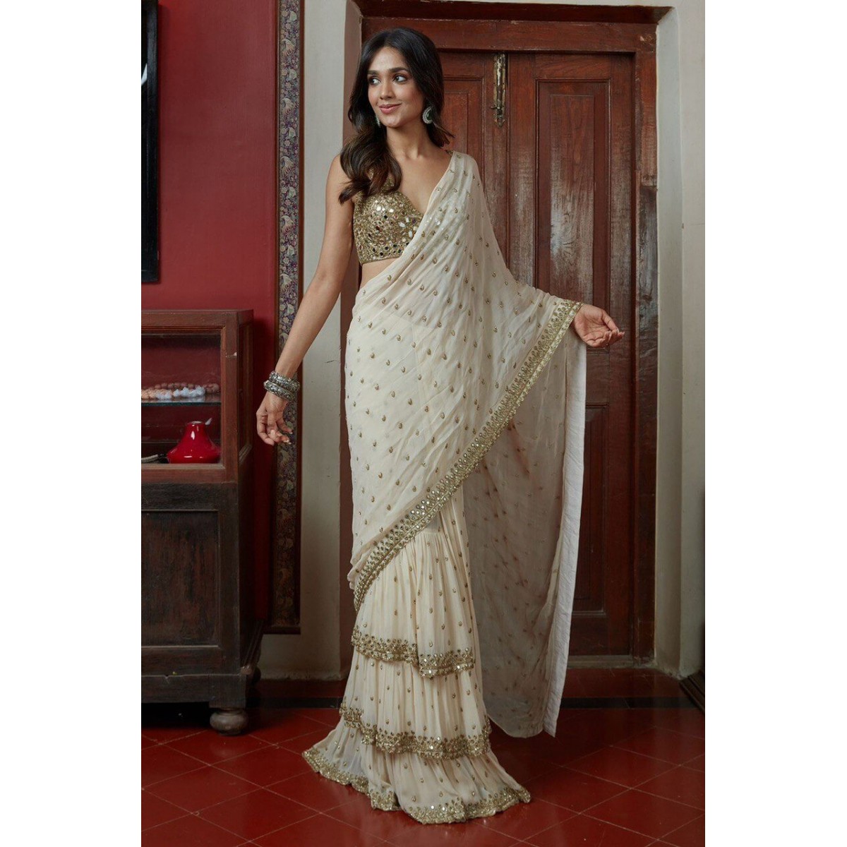 Ruffle stylish saree with real mirror work blouse